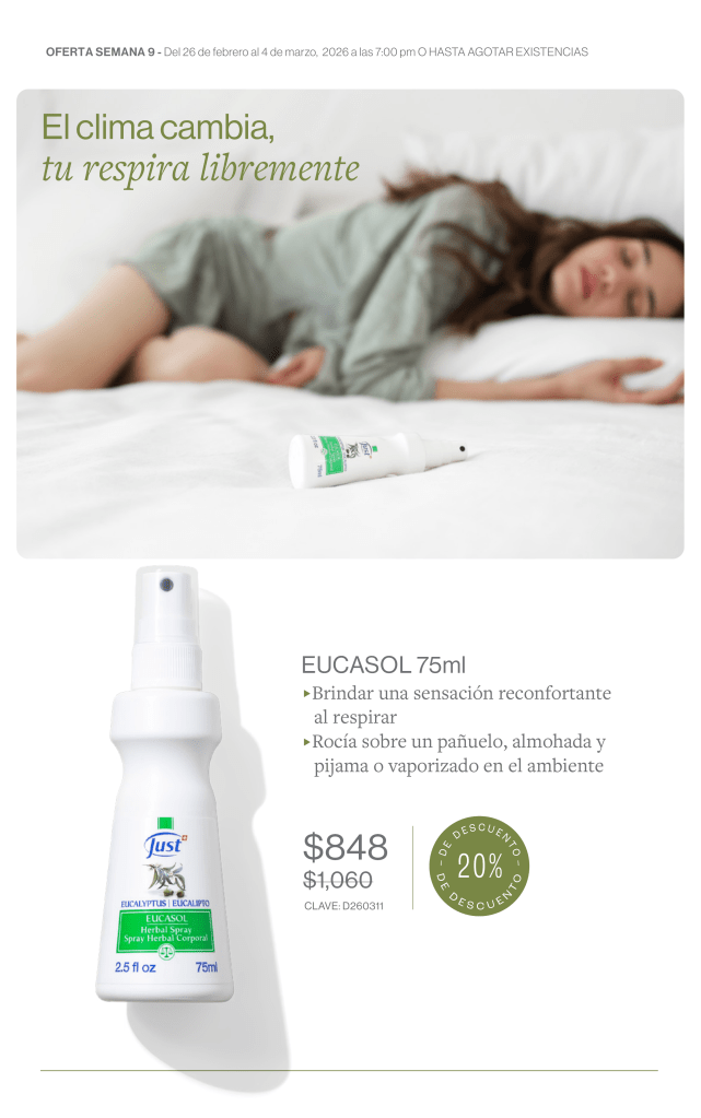 🌿 Eucasol 75ml (20% Desc.): El clima cambia, tú respira libremente. Brinda una sensación reconfortante inmediata al respirar. Solo necesitas rociarlo sobre un pañuelo, tu almohada, la pijama o vaporizarlo en el ambiente para disfrutar de sus beneficios. De $1,060 a solo $848.