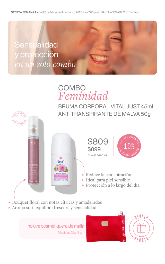 🌸 Combo Feminidad (10% Desc.): Sensualidad y protección en un solo combo. Incluye la Bruma Corporal Vital Just 45ml (un delicioso bouquet floral con notas cítricas y amaderadas) y el Antitranspirante de Malva 50g (reduce la transpiración y es ideal para piel sensible). De $899 a solo $809 + REGALO 🎁: Incluye una hermosa cosmetiquera de malla.